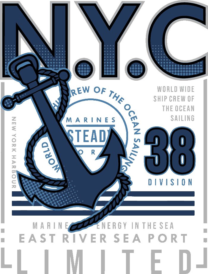- NYC Marines Limited – Ancla gigante, tipografía navy industrial, ropes y vibes de puerto neoyorquino. Puro crew ocean sailing meets streetwear militar, ideal para hoodies oversize, chaquetas bomber o parches. "World Wide Ship Crew of the Ocean" en azul marino profundo – para los que navegan la ciudad como mar abierto.