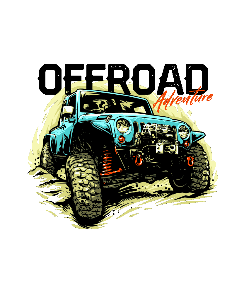 - Adventure Jeep Off-Road: Jeep Wrangler brutal modificado – suspensión elevada, winch, snorkel, barro y resortes en acción. Texto 'Adventure' en naranja neón para los amantes del 4x4, ruta extrema y off-road life.