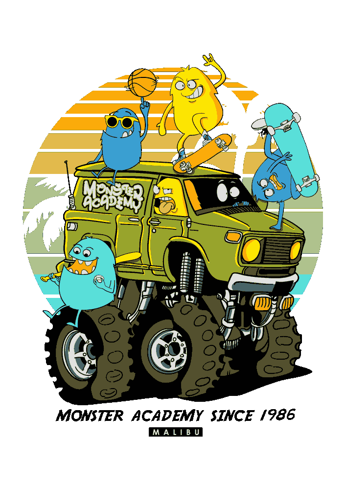 - Monster Academy Jeep Crew: La pandilla de monstruos azules, amarillos y turquesas posando en el Jeep verde custom – baloncesto, skate, gafas de sol, palm trees y sunset Malibu vibes. Pura energía Monster Academy con 'Malibu' signature.