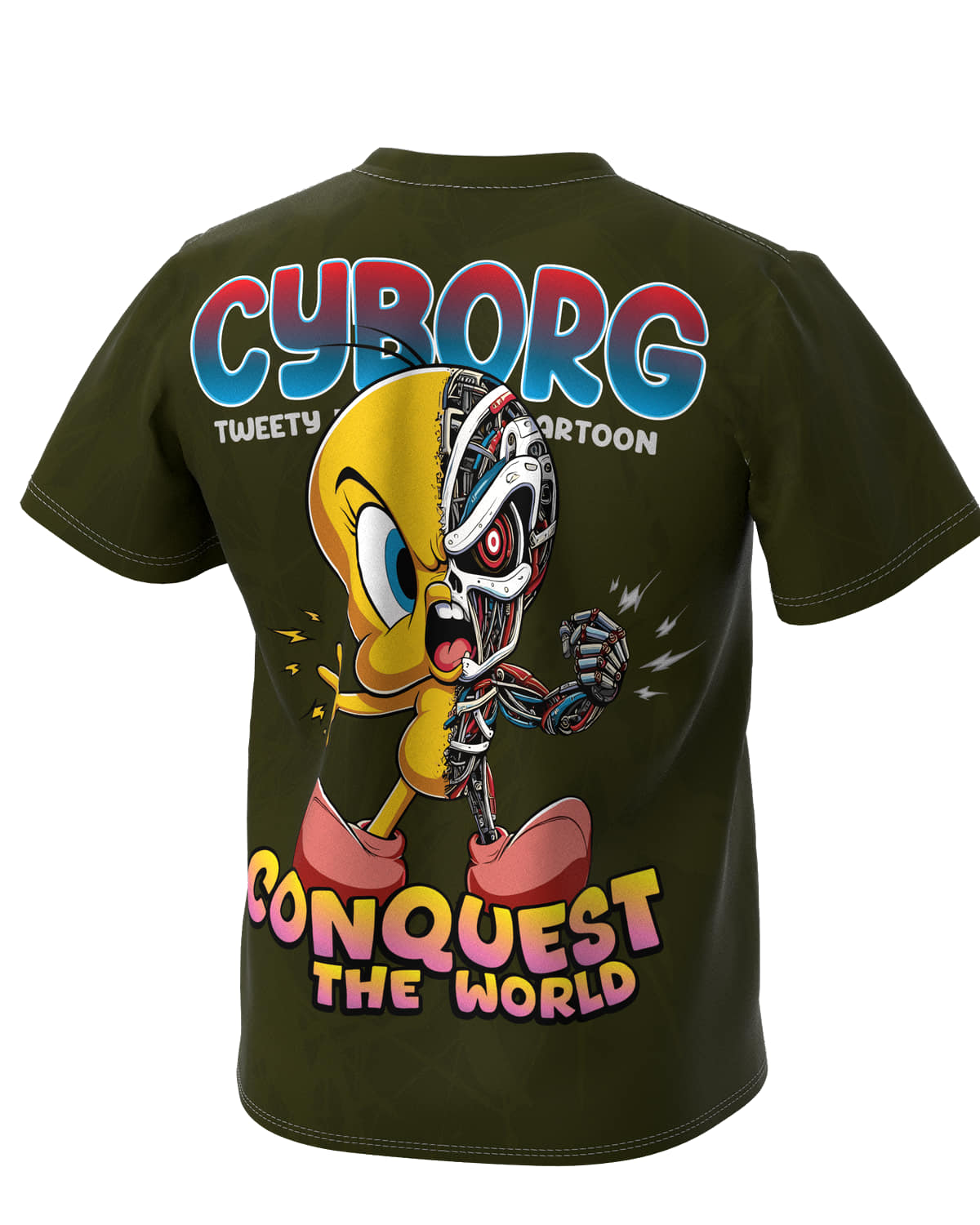 Tweety mitad amarillo cartoon clásico, mitad cyborg futurista con armadura metálica, ojo láser rojo, circuitos expuestos y brazo mecánico armado. Pose épica, relámpagos y texto "CYBORG CONQUEST THE WORLD" en gradiente neón azul-rojo que grita dominio total.