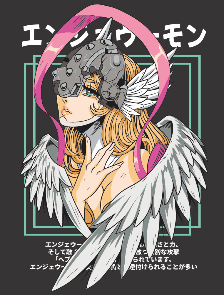 Engelwumon aparece con casco mecánico de combate, visor táctico, alas etéreas en tonos rosados y plateados, cabello dorado ondeante y aura cyber-punk. El texto japonés épico en la parte superior y la descripción de habilidades en kanji refuerzan su esencia Digimon: fuerza sobrehumana, ataques especiales y conexión con el "Heaven's Charm" para proteger aliados y destruir enemigos.
