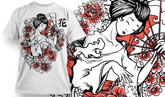 - Geisha Blossom – Geisha elegante rodeada de flores rojas y abanico, con fuerte contraste blanco, negro y rojo. Estilo japonés urbano refinado.