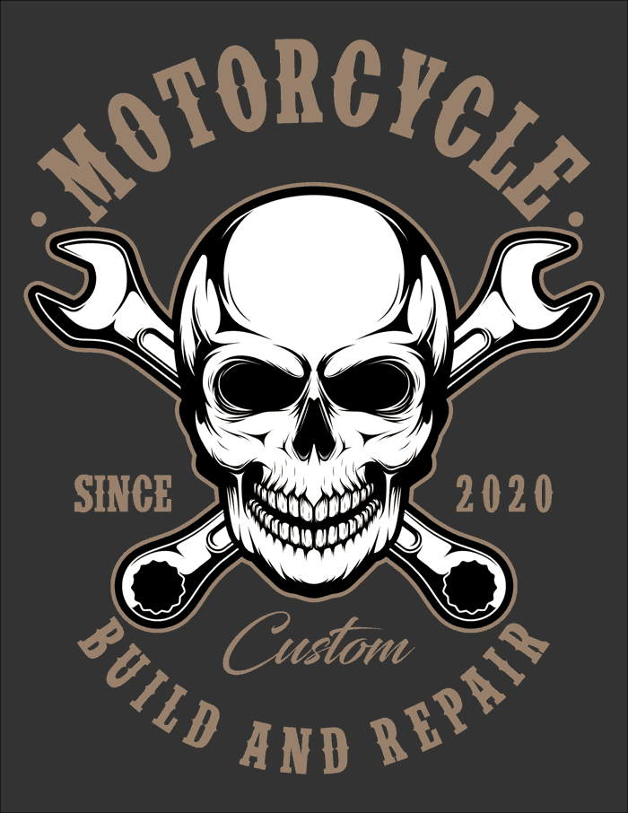 - Motorcycle Custom Since 2020 – Calavera con llaves inglesas cruzadas, texto 'Motorcycle Custom – Build and Repair – Since 2020'. Diseño biker old school para talleres de motos, rodadores y camisetas custom build.