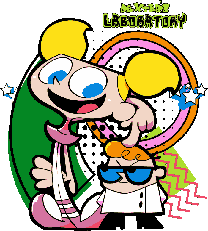 • Dexter's Laboratory – Dexter y Dee Dee en caos neón total, con círculos psicodélicos, colores vibrantes y ese laboratorio loco convertido en statement piece.