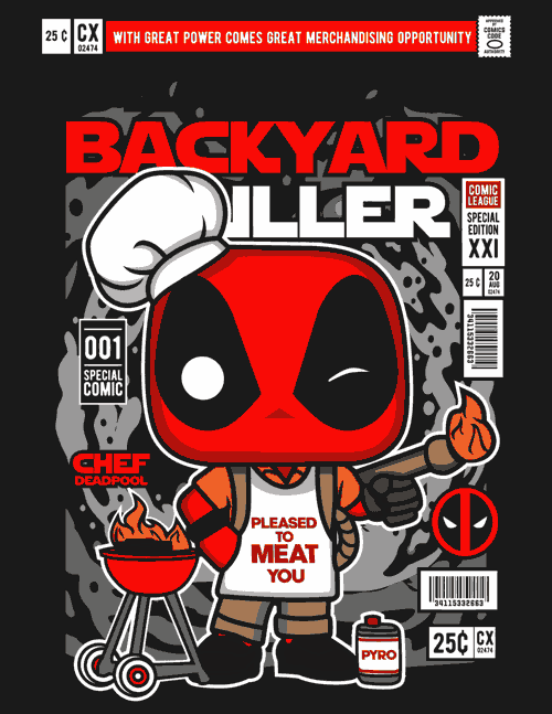 - Backyard Griller (Chef Deadpool) 🍖 Deadpool convertido en chef asador con gorro de cocinero, delantal y el clásico “Pleased To Meat You”. El Mercenario más divertido y glotón del universo.